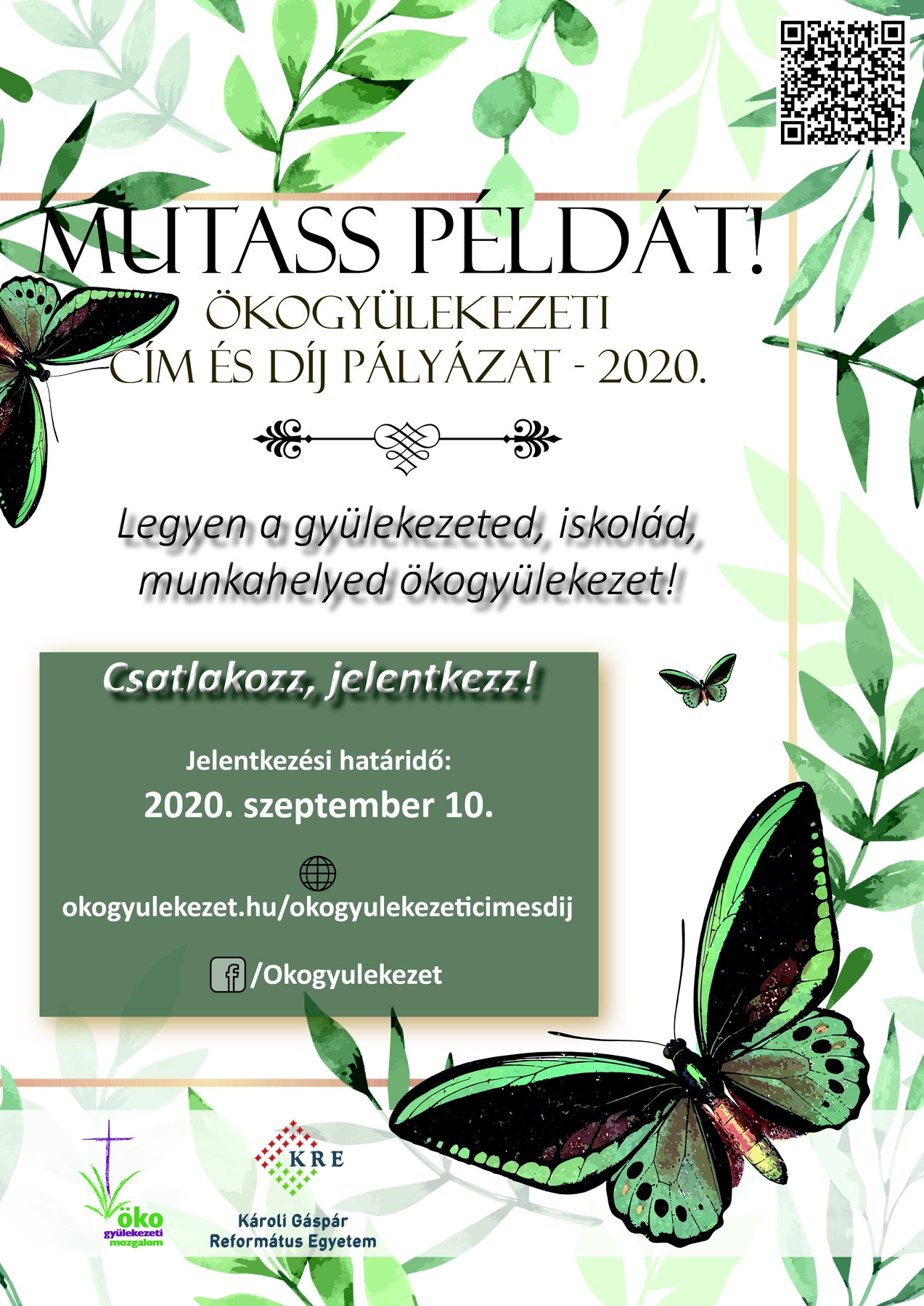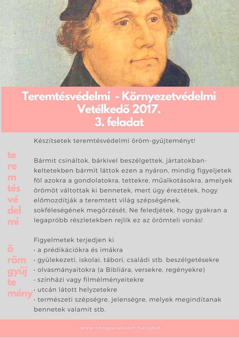 A Magyarországi Református Egyház Ökogyülekezeti Mozgalma pályázatot hirdet, a környezettudatosságban elkötelezett gyülekezeteknek, egyházi intézményeknek, közösségeknek. Fontos a környezetünk állapota? Gondosan bántok az ajándékba kapott erőforrásainkkal? Újrapapírt használtok? Takarékoskodtok a vízzel? Energiatakarékos égővel világítotok? Szabadban is szoktatok gyülekezeti alkalmakat tartani? Imádkoztok, tájékozódtok a környezet dolgairól? Házi sütemény, helyi termék van a szeretetvendégségen? Mutassatok példát másoknak is, jelentkezzetek ökogyülekezetnek!