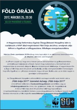 Adj egy pihenőórát a Földnek! A Magyarországi Református Egyház Ökogyülekezeti Mozgalma idén is csatlakozik a WWF által meghirdetett Föld Órája akcióhoz, amelynek célja felhívni a figyelmet a túlfogyasztásra, fölösleges energiahasználatra. Március 25-én, szombaton 20:30-tól egy órára kapcsoljuk ki az elektromos berendezéseket, pl. világítást, televíziót, számítógépet!