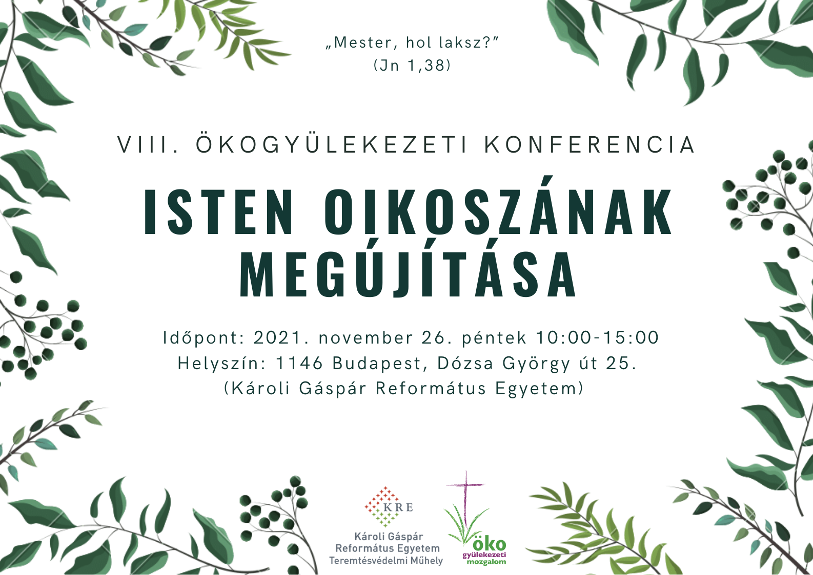 "Isten oikoszának megújítása" címmel rendezi meg az MRE Ökogyülekezeti Mozgalom soron következő éves konferenciáját. Időpont: 2021. november 26. péntek. Helyszín: Budapest, XIV. ker. Dózsa György út 25.