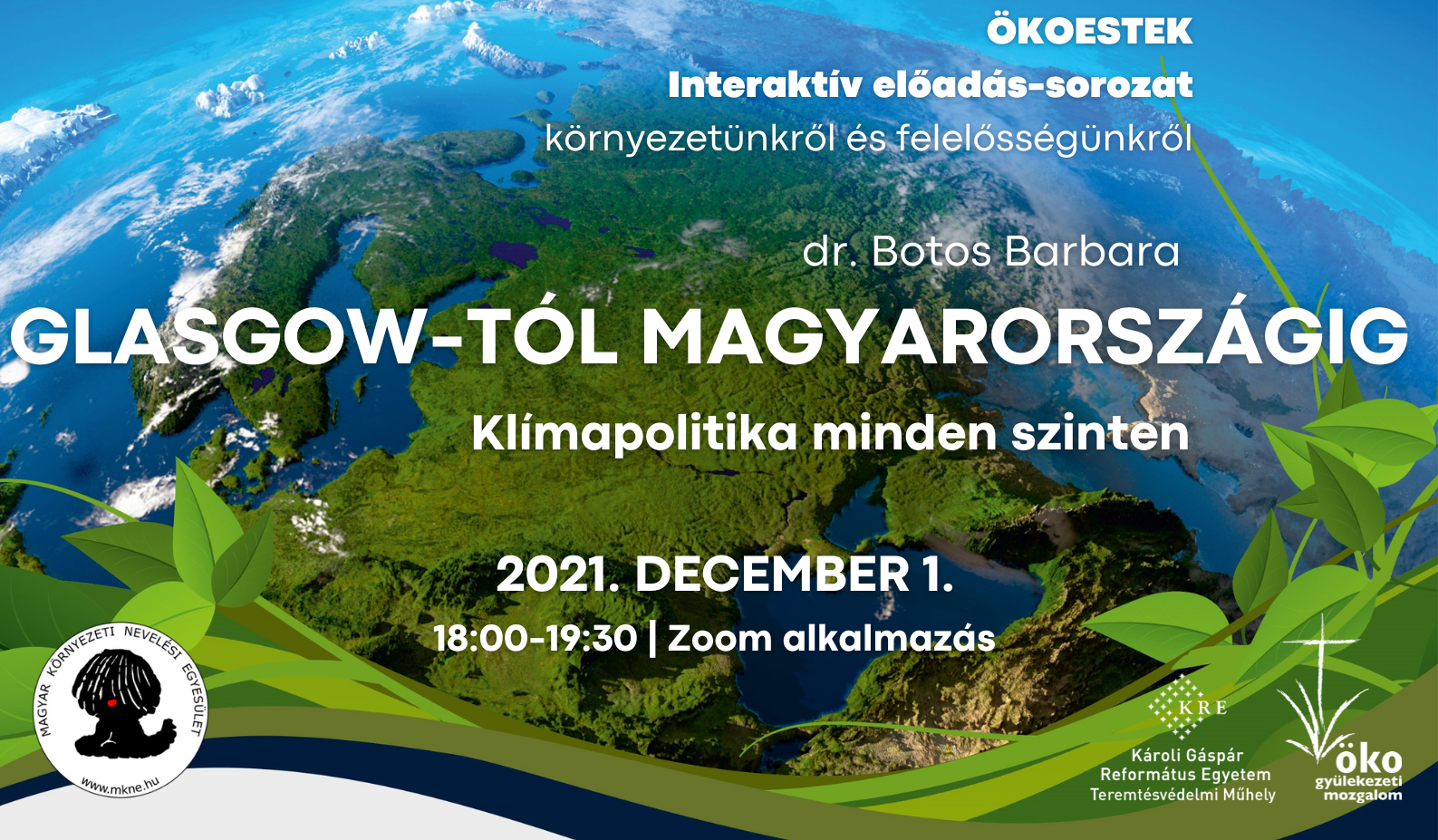 A Magyar Környezeti Nevelési Egyesület és az MRE Ökogyülekezeti Mozgalom ezévi utolsó ökoestjének vendége Dr. Botos Barbara klímapolitikáért felelős államtitkár-helyettes asszony volt, aki Farkas Lilla Nórával, az Óbudai Egyetem környezetmérnök szakos hallgatójával együtt beszélt a Glasgowban megrendezett COP26-klímakonferenciáról és annak eredményeiről.