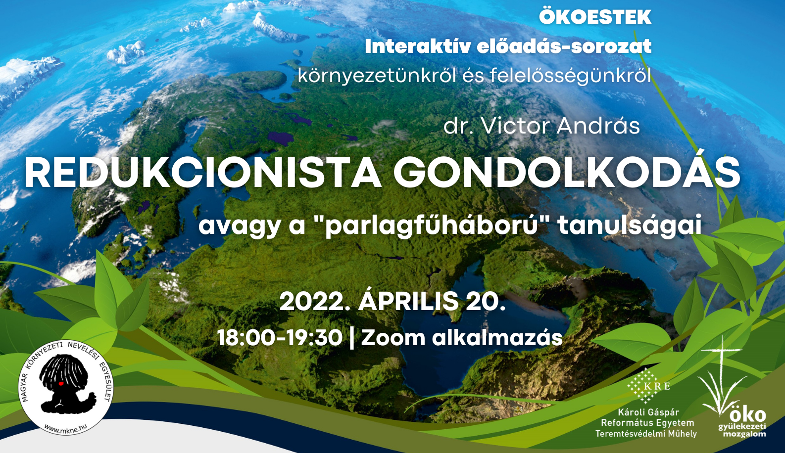 A Magyar Környezeti Nevelési Egyesület (MKNE) és a KRE Teremtésvédelmi Műhely áprilisi Ökoest előadásának meghívott vendége dr. Victor András volt, aki az MKNE korábbi elnöke, jelenleg tiszteletbeli elnöke, az Eötvös Loránd Tudományegyetem nyugalmazott kémia-szakos tanára, emellett az MRE Ökogyülekezeti Mozgalom tanácsának aktív tagja. Előadásának címe: A redukcionista gondolkodás (avagy a parlagfű-háború tanulságai), az előadás célja pedig az volt, hogy belássuk, komplex, környezetet érintő kérdésekről nem éri meg leegyszerűsítve gondolkodni.