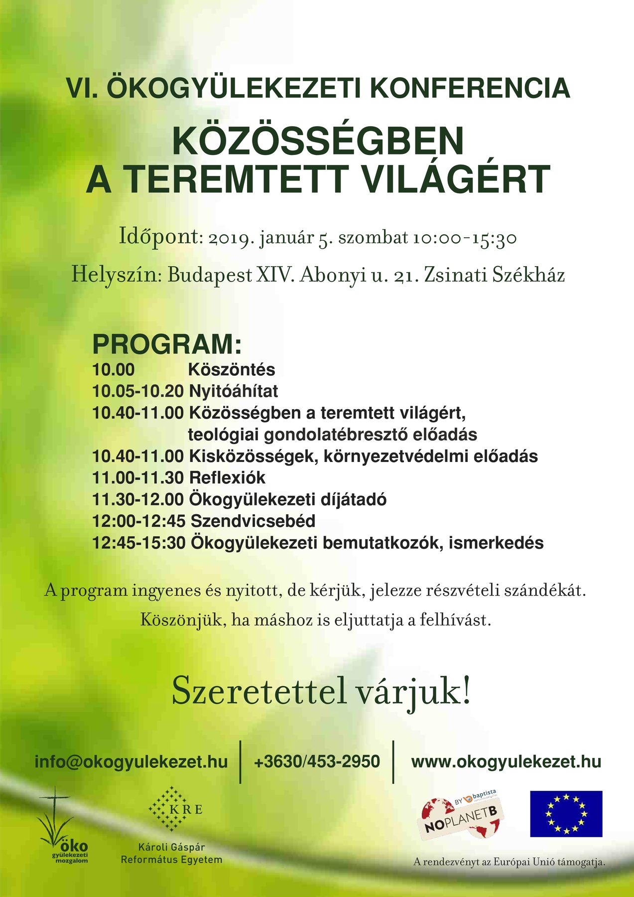 KÖZÖSSÉGBEN A TEREMTETT VILÁGÉRT címmel rendezi meg az Ökogyülekezeti Mozgalom soron következő konferenciáját. Időpont: 2019. január 5. szombat Helyszín: Budapest, XIV. ker. Abonyi. u. 21.